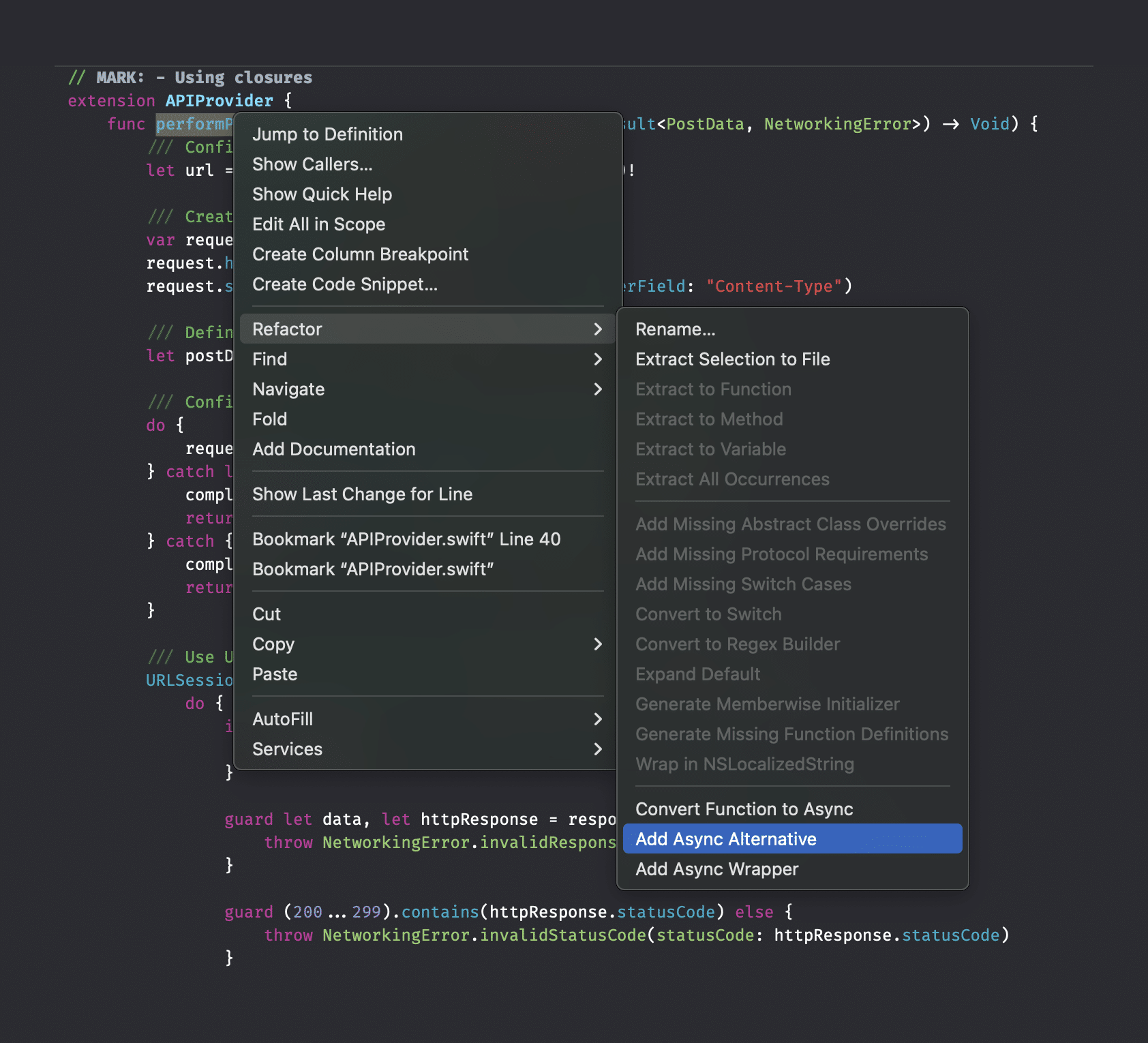 I’m sure you can’t wait to start rewriting the method to async/await. We’ll do it manually for the sake of practice, but I do want to let you know that Xcode offers refactoring options:
