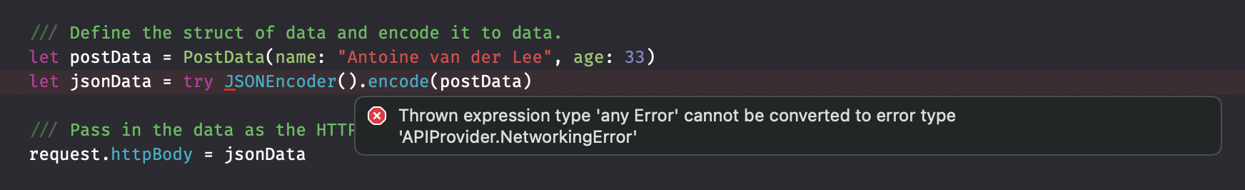 This is because we’ve configured a typed error of NetworkingError in our method definition. Therefore, you’ll have to use a do-catch combination inside your method: