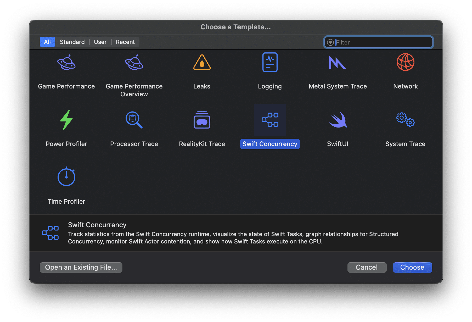 In this lesson, I’ll show you how to use Xcode Instruments to analyze suspension points for your apps. We will continue to use the same template as the first lesson, in which we analyzed our gradient generator app. If you’re starting fresh, make sure to profile the sample application by using the Swift Concurrency template: