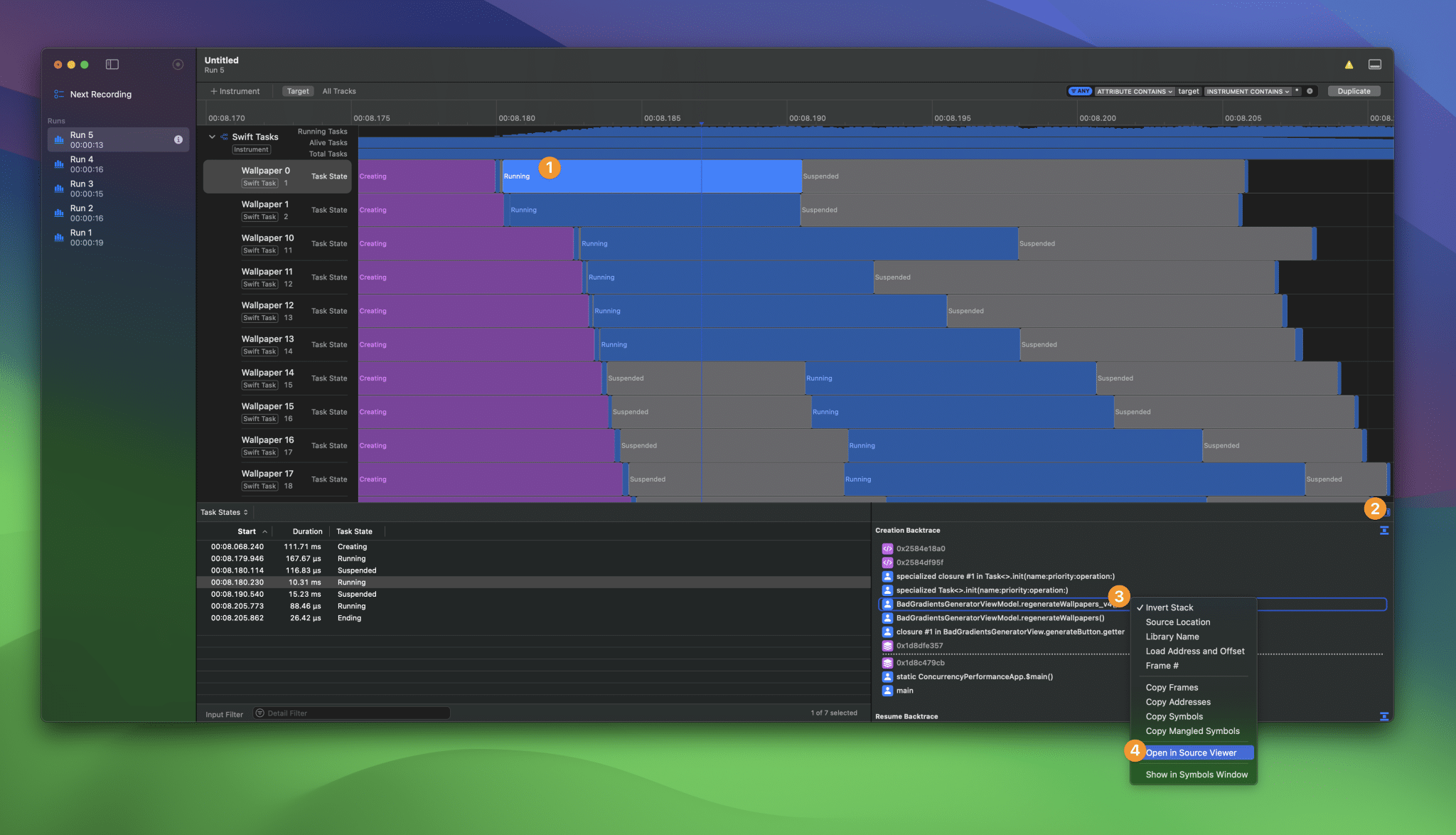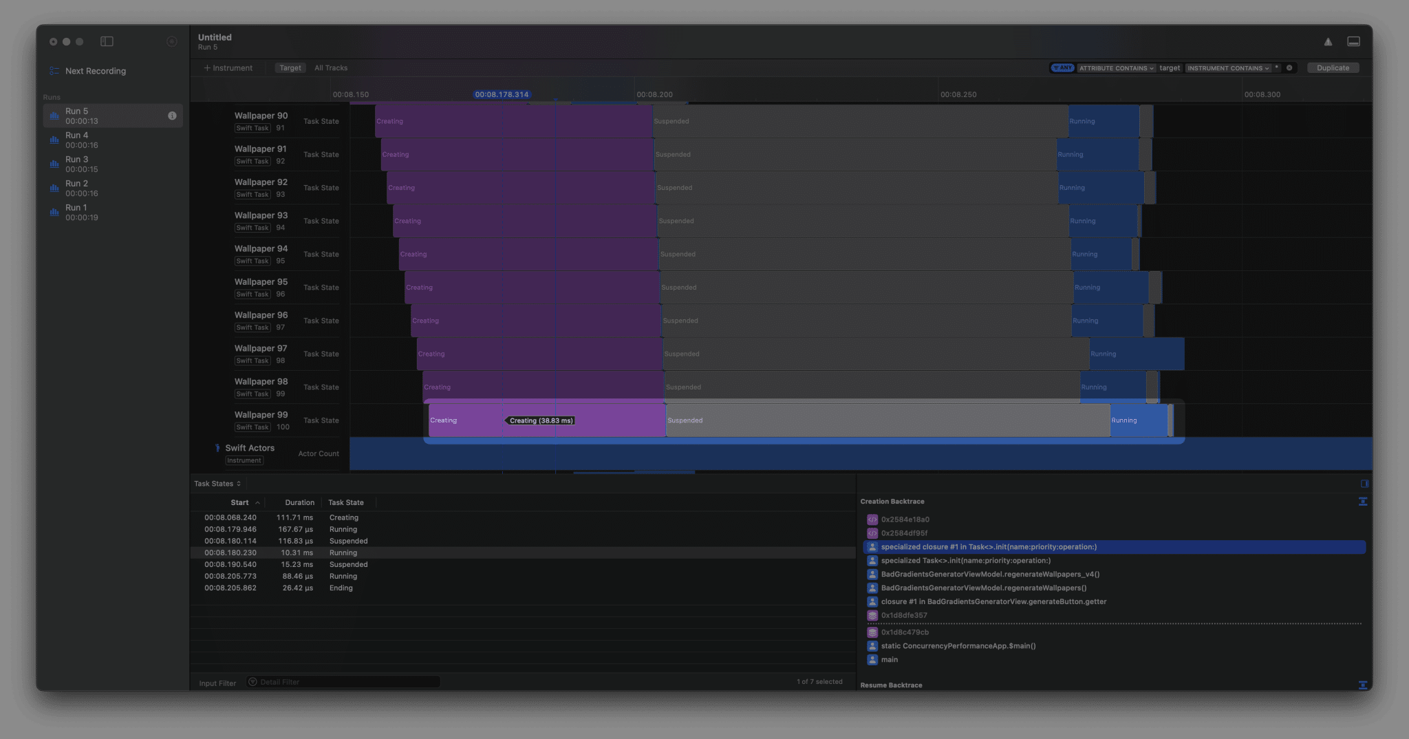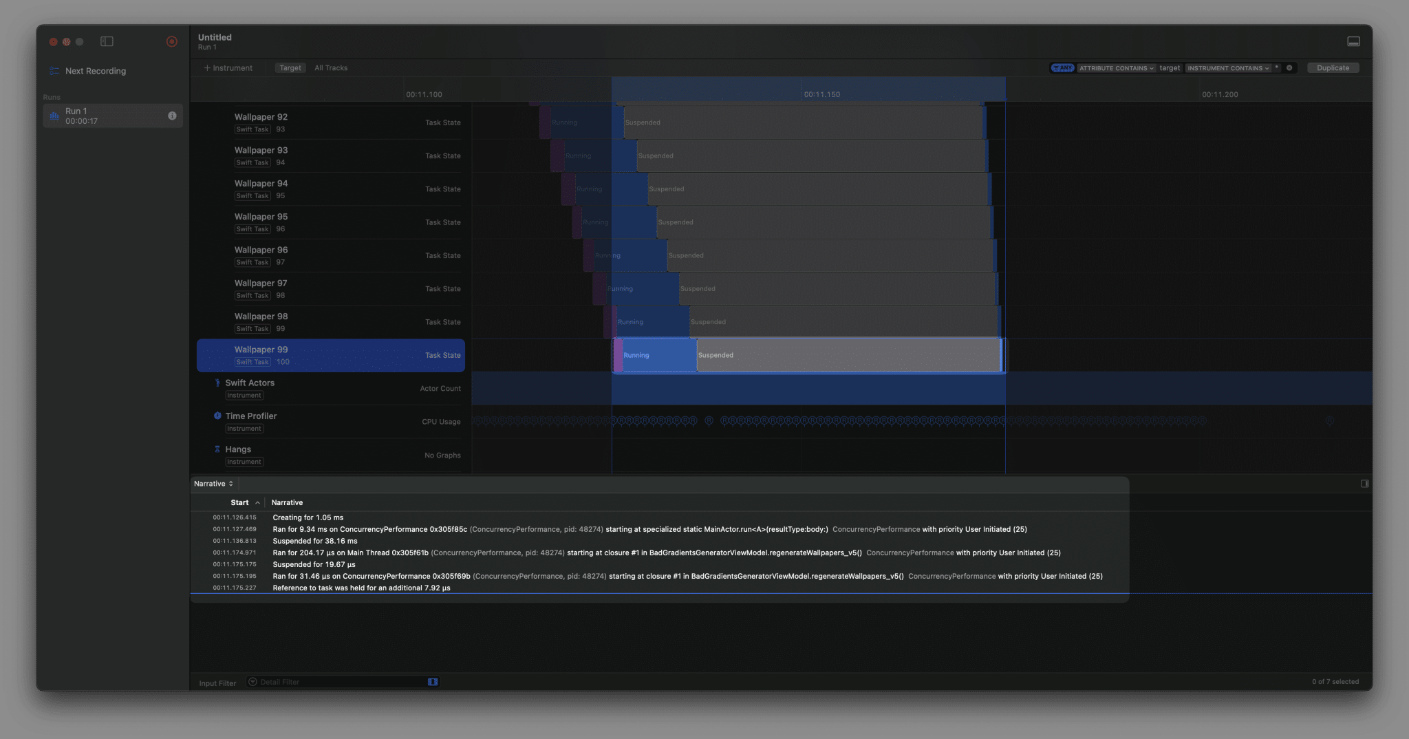 I’m purposely looking at the final wallpaper generation since it would be the clearest indication of wallpaper generation starting immediately. As you can see, we’re no longer suspending in the beginning and we’re directly starting the wallpaper generation. The narritive at the bottom shows an explanation of what happened. We’re still suspending in the end to get back from the MainActor.run into our @concurrent context, but this is not hurting any performance of other tasks running at the same time.