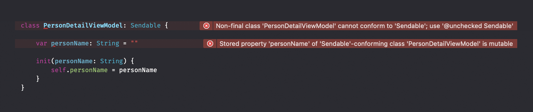 It seems that you’re not required to implement any protocol conformances, but the opposite is true. Once your type inherits this protocol, the compiler will verify whether there’s any unprotected mutable state. For example, we might have a view model for a person detail view: