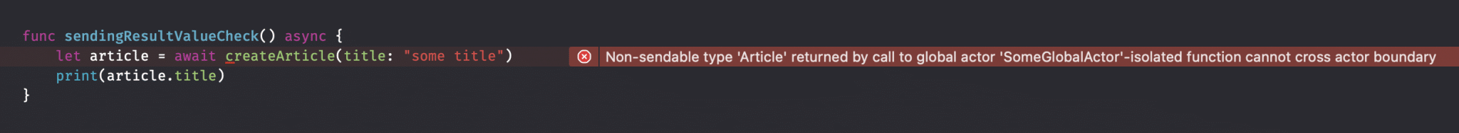 We would run into a compiler error due to a potential data race. However, the article value is defined in a local region, and isn’t mutated, so we know there’s no risk of a data race here. In this case, we can use the sending keyword to enforce ownership transfer to the printArticleTitle method: