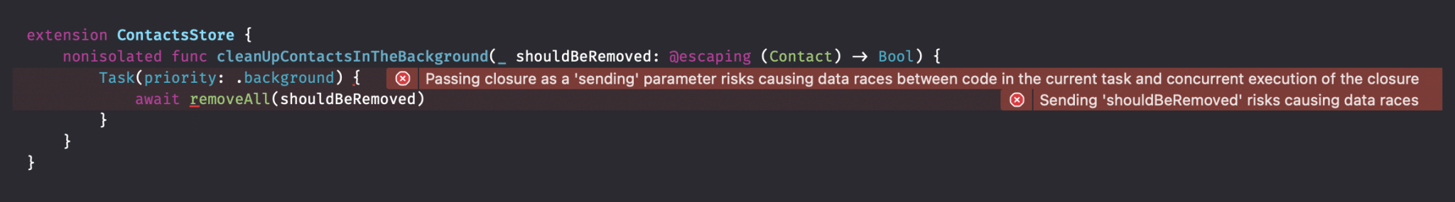 nonisolated func cleanUpContactsInTheBackground(_ shouldBeRemoved: @escaping @Sendable (Contact) -> Bool) {