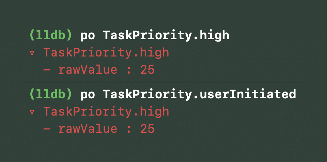 We’ve printed out the high and userInitiated priorities and we notice that the underlying priority is equal. This could also mean that you expect a current priority of userInitiated while the debugger prints out high. We now know these are actually the same priorities. It’s not explicitly described in Apple’s documentation and the underlying values can be changed in the future, but it’s likely that we have the userInitiated case as a self-describing alternative for more readable code when requiring high priority work.