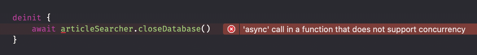 You might have noticed that we can’t call asynchronous methods inside our deinit. For the sake of this example, I’ve added two dummy methods to our ArticleSearcher: