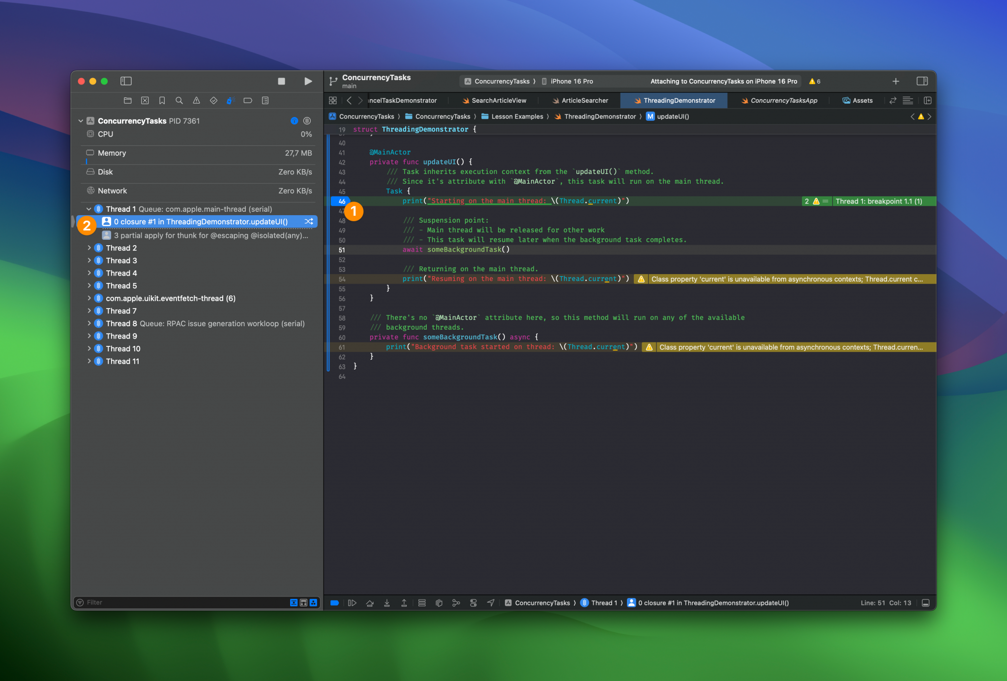 You can see that we’ve added a breakpoint at a code line inside our task (1) and the thread overview shows that it’s running on com.apple.main-thread (2). You can also make use of the following extension on Thread as you’ve might have seen throughout the sample projects: